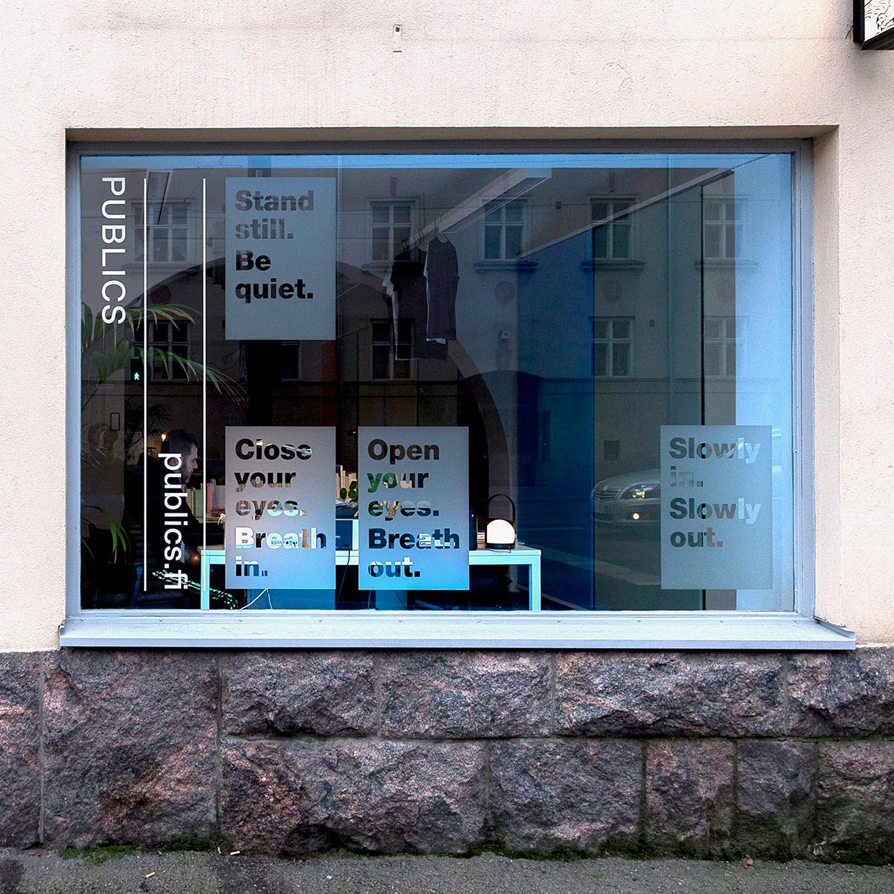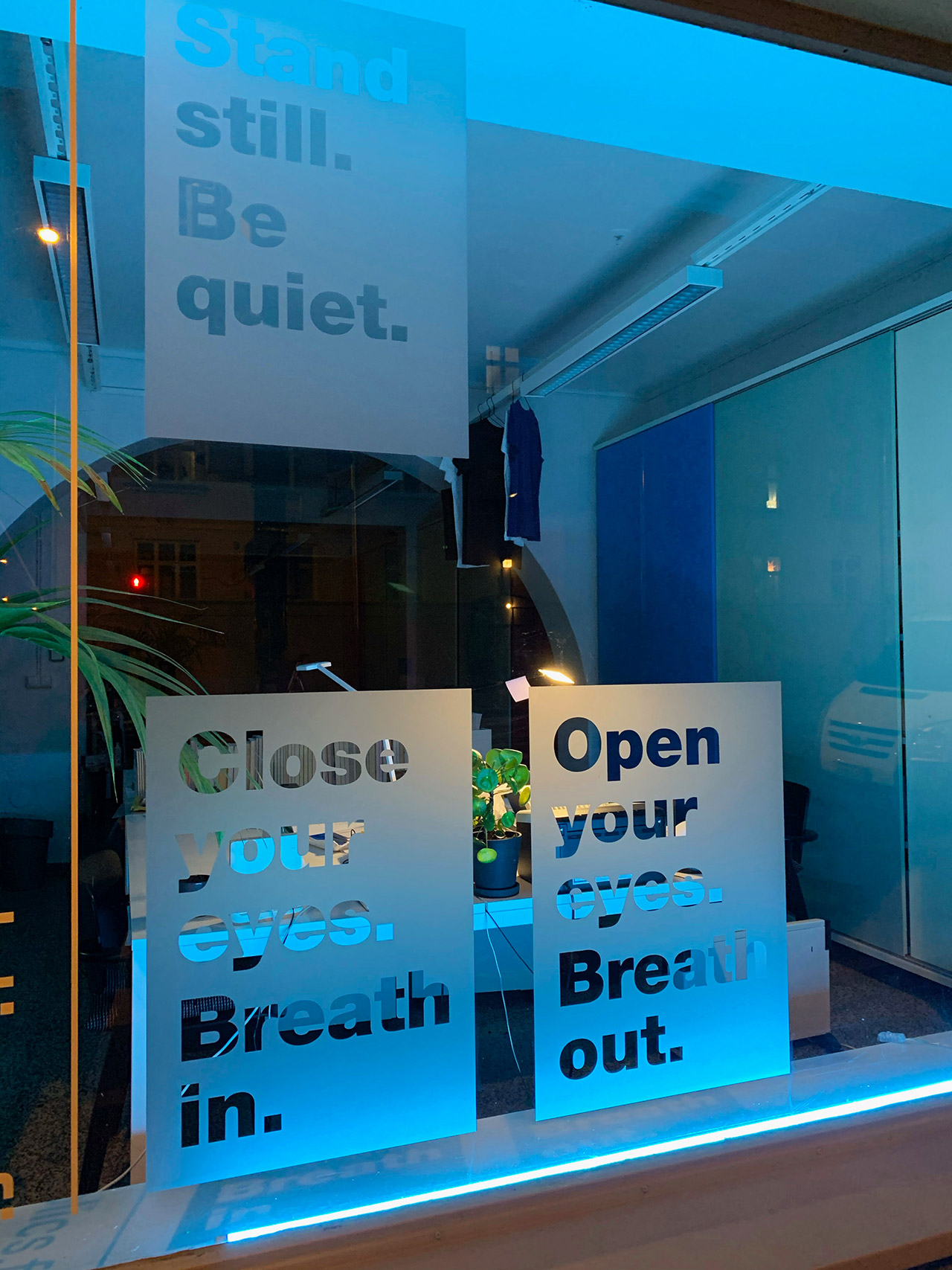 Ian Whittlesea presents four texts in the window of Publics. The texts function as both instruction and permission to the passerby. Stand still. Be quiet. As with a parent’s directions to a child the statements can be felt as unwanted and authoritarian or as a gentle encouragement to a better way. The simplicity of the text’s suggestions holds an implicit critique of the inattention of the everyday, and yet in these strange times could also be a description of the new normal, when breath and its control has become central to everybody’s lives. - Ian Whittlesea’s work explores the relationships between language, light, image and diagram both on the page and in the world. It is driven by a renegotiation of modernist and esoteric histories, especially those which propose possibilities of embodied transformation. From devoting five years to become a black belt in judo in order to better understand Yves Klein’s practice to exploring the Mazdaznan breathing and movement exercises that Johannes Itten taught at the Bauhaus he has consistently attempted to elucidate Sol LeWitt’s statement: Conceptual artists are mystics rather than rationalists. They leap to conclusions that logic cannot reach.