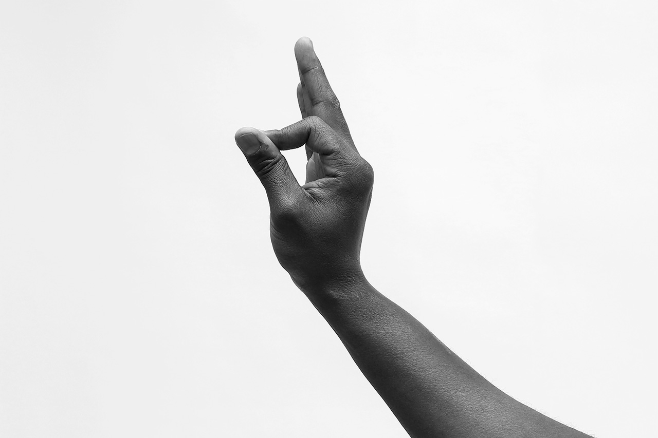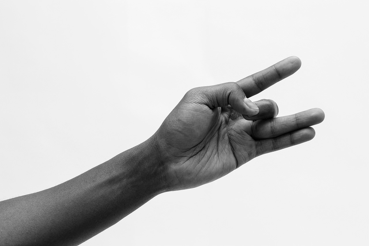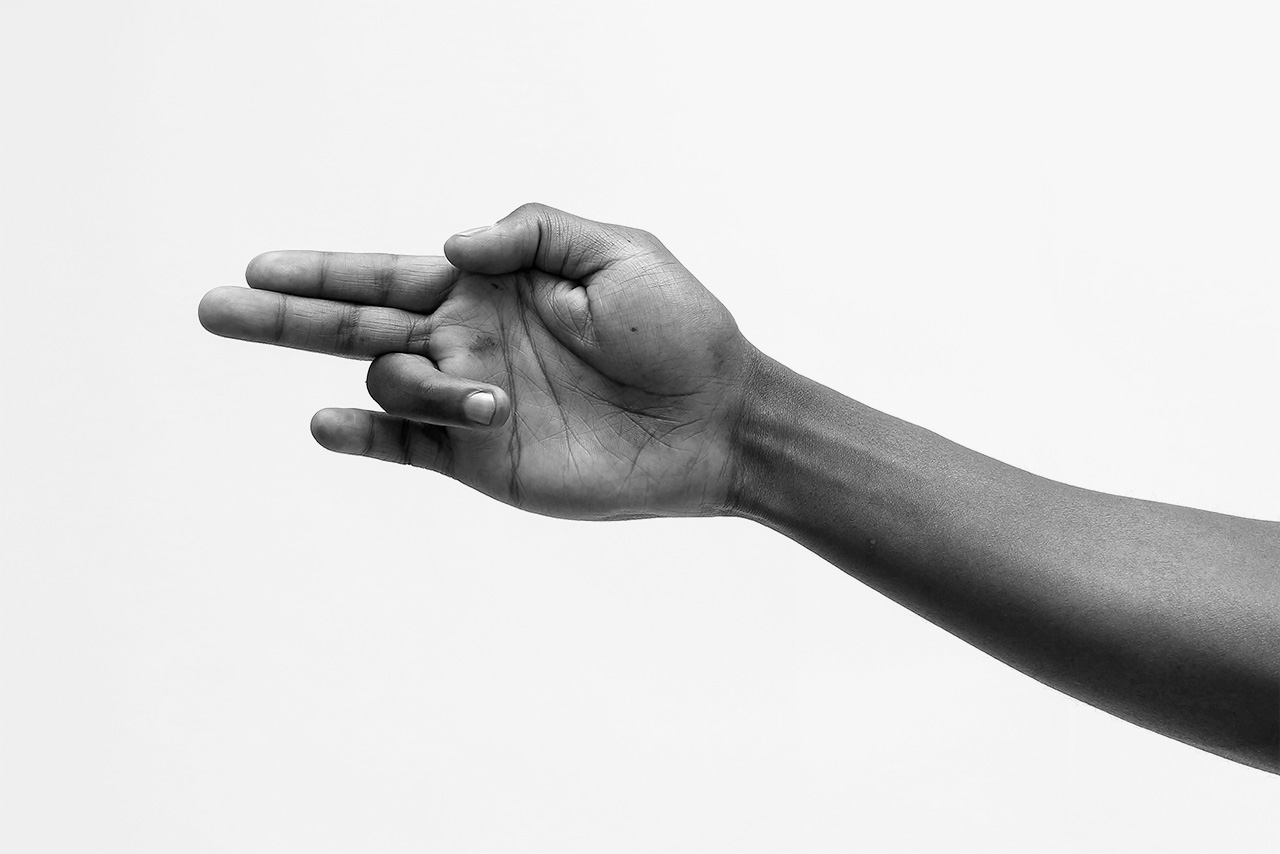 Ery Nzaramba demonstrating twelve Finger Exercises from the Egyptian Postures The Finger Exercises are part of the Egyptian Postures, the most advanced Mazdaznan exercises described by Dr. Otoman Zar-Adusht Ha'nish and taught to the first generation of Bauhaus students by Johannes Itten. The Finger Exercises are always illustrated in Mazdaznan publications unaccompanied by any explanatory text or instructions. Ha'nish claimed that the exercises he taught descended directly from the Pharaohs, and that they stirred the blood and rechanneled internal energy in ways that contributed to the perpetual evolution of humanity. The exercises were also said to result in auto-illumination, the participants body generating light from within that would be visible to any onlooker. The series of photographs that make up Ery Nzaramba demonstrating twelve Finger Exercises from the Egyptian Postures have been shown in several contexts, often as posters flyposted in the public realm. Like Ha'nish's original illustrations they appear unmediated, with no accompanying explanation or attempt to contextualise them.