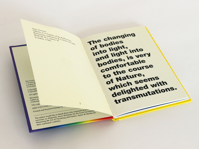 Becoming Invisible Becoming Invisible is a guide and visual primer that draws on the literature of Rosicrucianism, theosophy and esoteric yoga. It describes how, through visualisation and breathing exercises, the reader will be able to split light into its constituent parts and then recombine the seven colours of the spectrum to form a glowing white cloud that envelops its creator. Thus, potentially, anyone can achieve the goal of becoming invisible. Ian Whittlesea is an artist whose work is concerned with the ability of text to transform the physical and psychic state of the viewer. His translation of Yves Klein's Les Fondements du Judo was published in 2009 and his newly illustrated and appended edition of Mazdaznan Health & Breath Culture in 2012. These texts, along with Becoming Invisible, have been collectively described as 'instruction manuals for transcendental exercise'. The Everyday Press was founded in 2007 by artist Arnaud Desjardin to publish the work of visual artists as printed matter. Becoming Invisible
