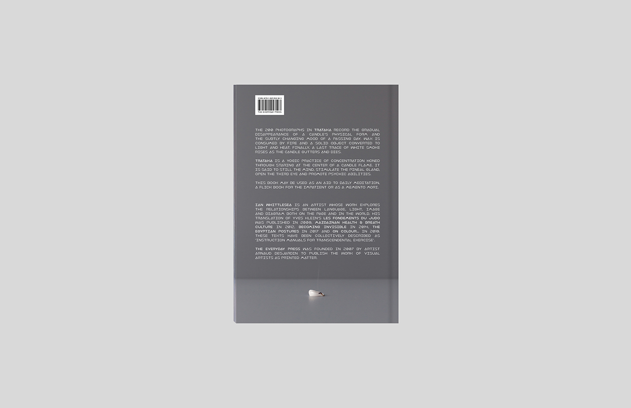 All of which is a suggestion as to why this book exists. What it does is another matter. Trataka consists simply of two hundred photographs of a candle as it burns in daylight. Although it resembles a series of stills from a film each photograph was taken individually, necessitating six hours of concentration and attention to ensure the exposure was adjusted and the shutter depressed every two minutes. The photographs record the subtly changing light of a passing November day, as well as the gradual disappearance of the candle’s physical form. Wax is consumed by flame and a solid object converted to light and heat. The final photograph shows the moment the flame goes out. A trace of white smoke rises from the extinguished candle wick.