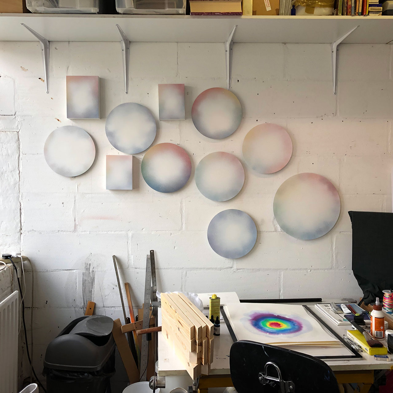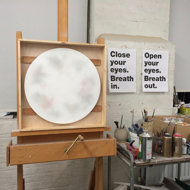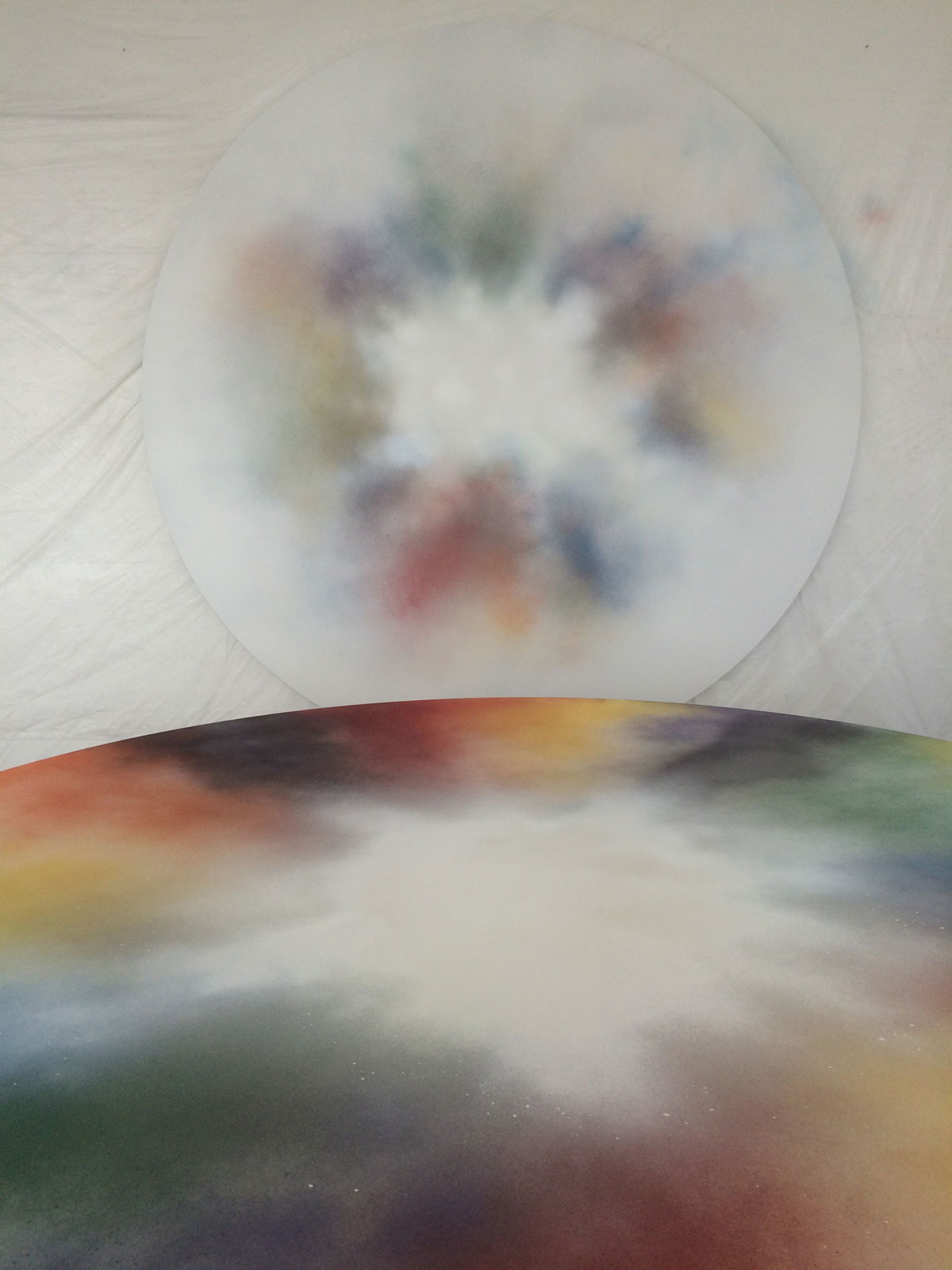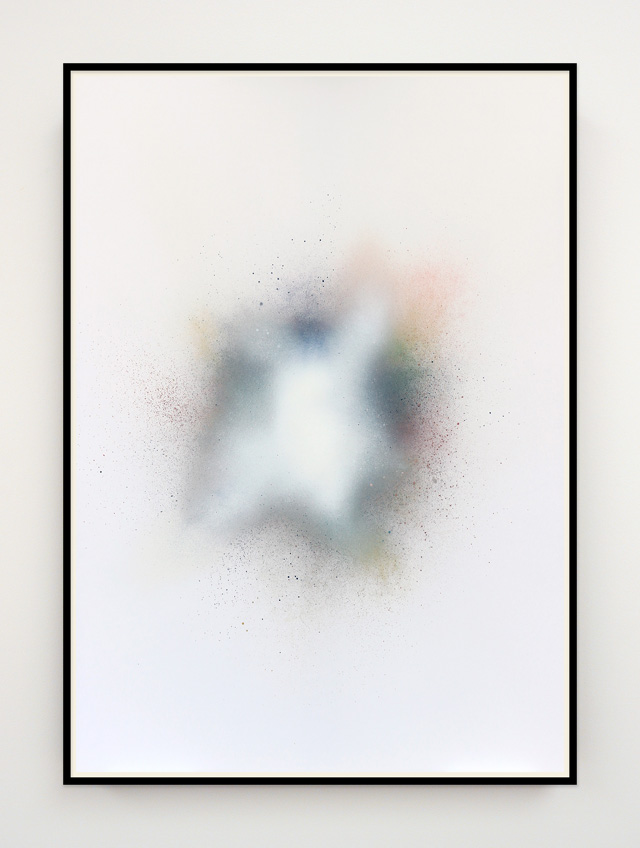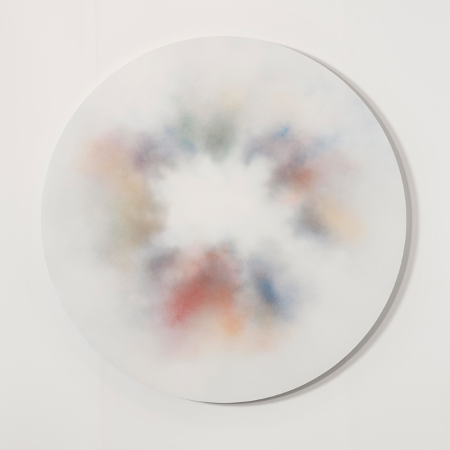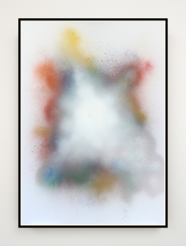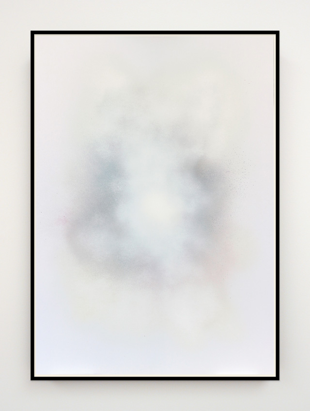 Ian Whittlesea's White Cloud Forming paintings are a series of works on paper and aluminium that relate to his books On Colour... and Becoming Invisible. The books draw on the literature of Mazdaznan, Rosicrucianism, Theosophy and esoteric yoga and describe how, by means of visualization and breathing exercises, the reader can combine the seven colours of the spectrum to create a glowing white cloud that renders anything contained within it invisible. The White Cloud Forming paintings are, in part, an attempt to manifest this cloud of invisibility. Made using only sprayed pigment, without brushes or any physical contact with the paper or support, they are simultaneously a representation of another's mystical state and entirely abstract records of the process of their own making. They have an ethereal presence that speaks of both their esoteric subject matter and their means of production. The veils of spectral colour, and the airborne and air-propelled method of application, parallel Whittlesea's ongoing work with breath and breath control. Resembling the cloud studies of Constable and Turner the paintings draw on a complex group of antecedents, including Lawrence Weiner's early spray painted works, John Latham's One Second Drawings, colour field painting of the 1950s, Robert Irwin's luminous disc paintings of the 1960s and representations of the ineffable made by spiritualists and occultists. In their reference to the void the paintings bring to mind Whittlesea's earlier work on Yves Klein, while their use of a limited, predetermined, colour palette and system of making recalls the work of Sol LeWitt, and in particular his dictums that 1. Conceptual artists are mystics rather than rationalists. They leap to conclusions that logic cannot reach. and 5. Irrational thoughts should be followed absolutely and logically.