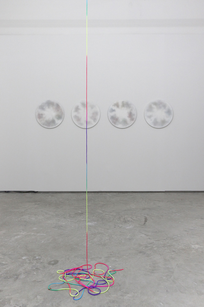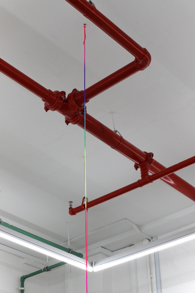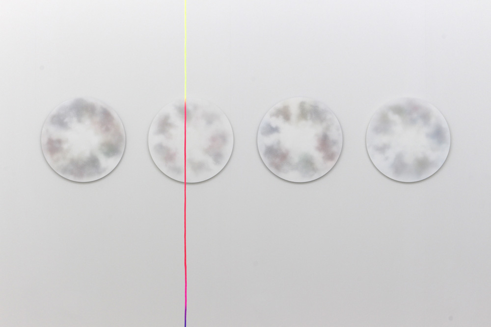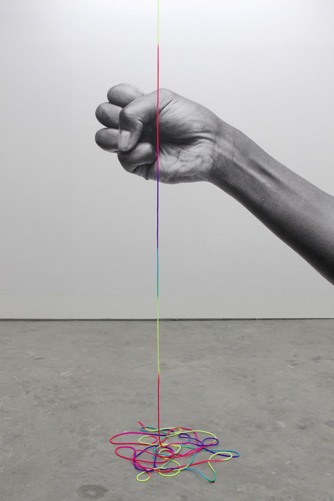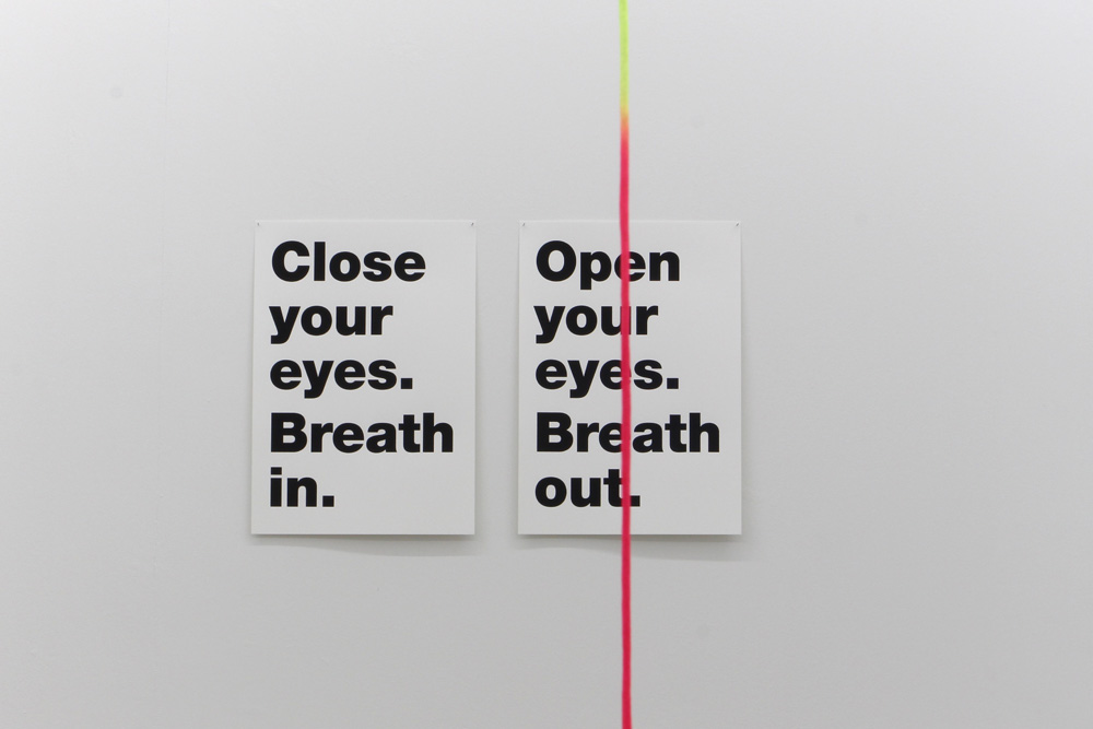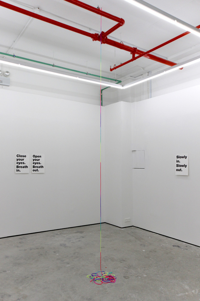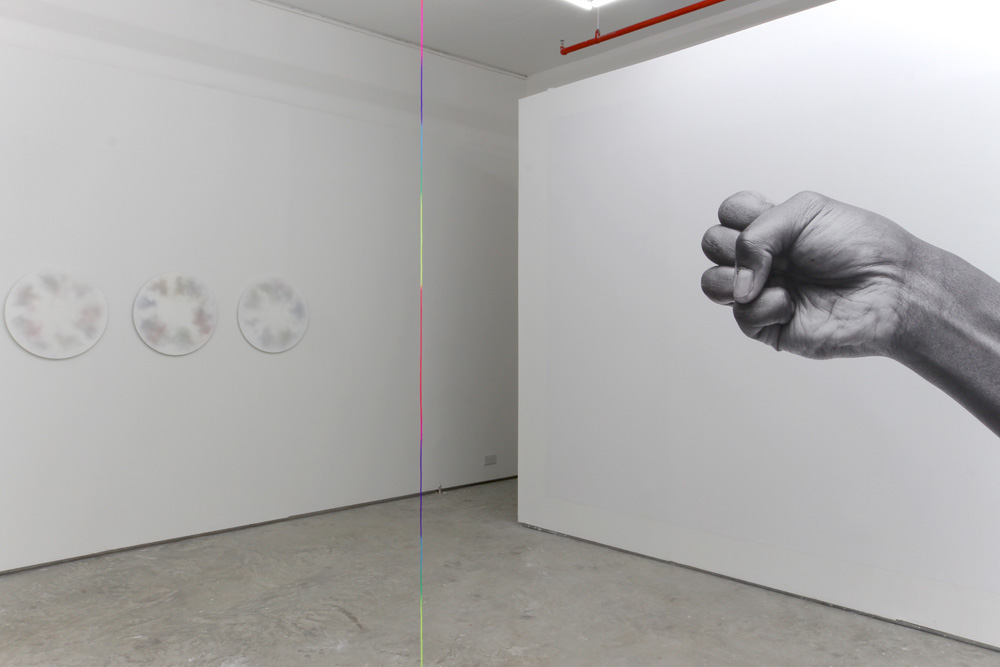 Ian Whittlesea: In the beginning... is the first show at 1961 and the first solo exhibition of British artist Ian Whittlesea outside Europe. The title serves to introduce both gallery and artist. Ian Whittlesea (b. 1967, UK) lives and works in London. His consistent engagement with the legacy of conceptual art, and with the ability of words to transform the physical and psychic state of the viewer, has taken text into the expanded field, while his publications have been described as 'instruction manuals for transcendental exercise’. For In the beginning... Whittlesea has installed an apparently disparate group of works united by an economy of means and by his interest in esoteric exercise, breath control and written instructions. Dominating the space is a huge, fly-posted, image of a clenched fist. The image is taken from a series of photographs showing actor Ery Nzaramba demonstrating a group of 12 finger positions that, in a brief moment of mysticism at the heart of modernism, Swiss artist and colour theorist Johannes Itten taught his students at the Bauhaus. These 12 finger exercises are reproduced in contemporary books without instruction or explanation, their meaning and purpose too powerful to be written down, but Itten claimed that with the accompanying breathing exercises they would result in auto-illumination, the participant’s body generating light from within visible to any onlooker. This relationship between the body and breath, word and light informs the other works in the space. A group of silk-screened texts on paper are pinned directly to the wall. Their statements are equally applicable to an actor in a ritual exercise or a contemporary viewer of art in a gallery: Stand still. Be quiet. | Close your eyes. Breath in. | Open your eyes. Breath out. | Slowly in. Slowly out. The texts sit opposite and alongside a group of paintings on aluminium from Whittlesea’s ongoing White Cloud Forming series. These relate to his book Becoming Invisible. The book describes how, by means of visualization and breathing exercises, the reader can combine the seven colours of the spectrum to create a glowing white cloud that renders anything contained within it invisible. The White Cloud Forming paintings are, in part, an attempt to manifest this cloud of invisibility. Made using only sprayed pigment, without brushes or any physical contact with the support, they are simultaneously a representation of another’s mystical state and entirely abstract records of the process of their own making. They have an ethereal presence that speaks of both their esoteric subject matter and their means of production. The veils of spectral colour, and the airborne and air-propelled method of application, parallel Whittlesea’s on-going work with breath and breath control. The paintings draw on a complex group of antecedents, including Lawrence Weiner’s early spray painted works, John Latham’s One Second Drawings, colour field painting of the 1950s, Robert Irwin’s luminous discs of the 1960s and representations of the ineffable made by spiritualists and occultists. Finally, in the centre of the space, a thin thread hangs from the ceiling or like the Indian rope trick rises from a tangle of colour on the floor. Entitled Spectral Concentration Device, the cord has been dyed in the colours of the rainbow and seems to simultaneously draw colour from the air and give it back to the space around it, intensifying and locating the work beyond. — Ian Whittlesea (b. 1967, UK) lives and works in London. He has been commissioned by the Whitechapel Gallery & Fatos Ustek to produce a major new work for London Art Nights 2017 and his book The Egyptian Postures will be launched at the LA Art Book Fair 2017. His recent solo exhibitions include Breath is Life, Grundy Art Gallery, Blackpool UK (2015), Attaining Cosmic Consciousness, Tenderbooks, London UK (2014) and A Breathing Bulb, Marlborough Contemporary, London UK (2014). Group exhibitions include Now is forever lasting constant in the mind, Van Abbemuseum, Eindhoven (2016), Exercises in Empathy, Site, Sheffield UK (2015), Resource, Bluecoat, Liverpool UK (2015) and Everything is About to Happen, Artists Space, NY USA (2014). He is represented by Marlborough Contemporary, London and Uqbar Office, Amsterdam. Ian Whittlesea: In the Beginning opens on Tuesday 10 January and runs through Saturday 4 March 2017. The exhibition is open from 2-8pm on Fridays and Saturdays, and by appointment.