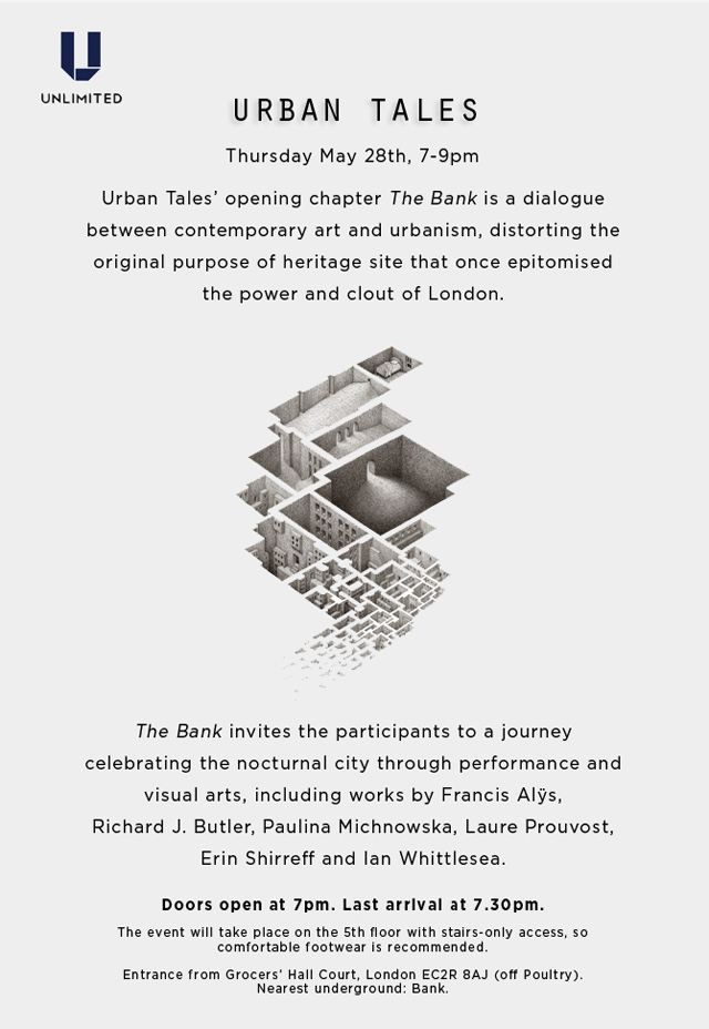 Urban Tales - The Bank The Midland Bank Building, 27-35 Poultry, London The Bank invites the participants to a journey celebrating the nocturnal city through performance and visual arts, including works by Francis Alys, Richard J. Butler, Paulina Michnowska, Laure Prouvost, Erin Shirreff and Ian Whittlesea. |