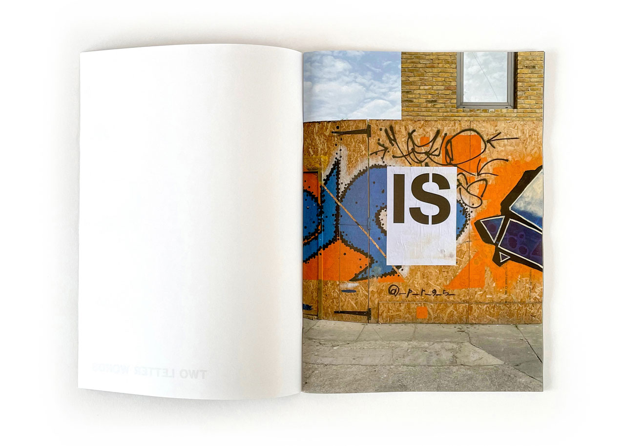 Two Letter Words In the spring of this year, as I walked from my home in Wapping to my studio in Mile End, I noticed these fly-posters appearing. Pasted on top of existing graffiti most vanished after a day or two, torn down or sprayed over, but some are still there. I began to photograph them, and the photographs are collected in a new zine called Two Letter Words. |